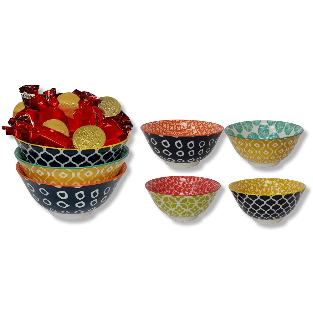 מארז מקסים הכולל 3 קערות מרק צבעוניות בגודל 15.5×7 ס”מ, עם מילוי מתוק של 8 פרלינים משובחים ו-5 מטבעות שוקולד חגיגיים.