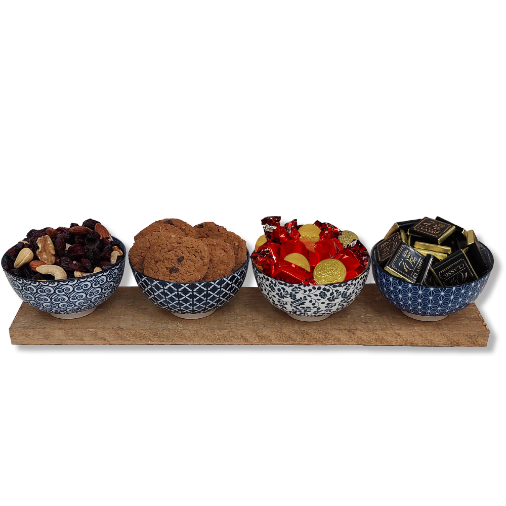 4 קעריות עם 16 נפוליטנים, 7 פרלינים, 5 מטבעות שוקולד, 8 עוגיות ו-200 גרם מיקס אגוזים וחמוציות גודל הקערית 11.5×6 ס"מ, הלוח עץ הינו קרש פשוט המיועד לצורכי אירוז